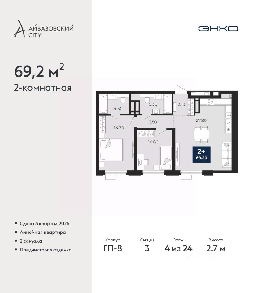 2-комн. квартира от застройщика с предчистовой отделкой в ЖК ''Айвазовский City'' на 4 этаже. Общая площадь: 69.2 кв.м., жилая: 24.9 кв.м., площадь просторной кухни-столовой: 27.8 кв.м. Комнаты изолированные, все окна выходят на одну сторону. В квартире два совмещенных санузла. Высота потолков 2.7 м.