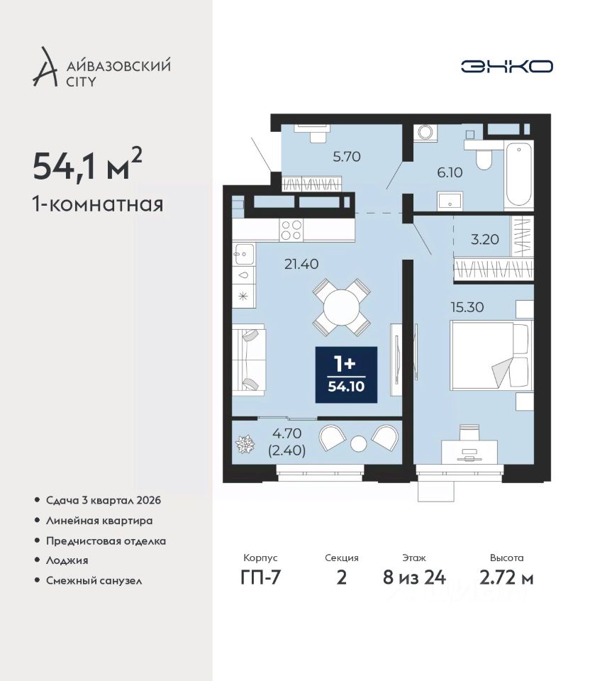 Однокомнатная квартира с предчистовой отделкой в ЖК ''Айвазовский City'' на 8 этаже. Общая площадь: 54.1 кв.м., жилая: 15.3 кв.м., площадь просторной кухни-столовой: 22 кв.м. Все окна выходят на одну сторону. В квартире одна лоджия, один совмещенный санузел. Высота потолков 2.72 м.