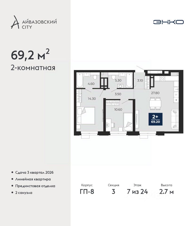 2-комн. квартира от застройщика с предчистовой отделкой в ЖК ''Айвазовский City'' на 7 этаже. Общая площадь: 69.2 кв.м., жилая: 24.9 кв.м., площадь просторной кухни-столовой: 27.8 кв.м. Комнаты изолированные, все окна выходят на одну сторону. В квартире два совмещенных санузла. Высота потолков 2.7 м.