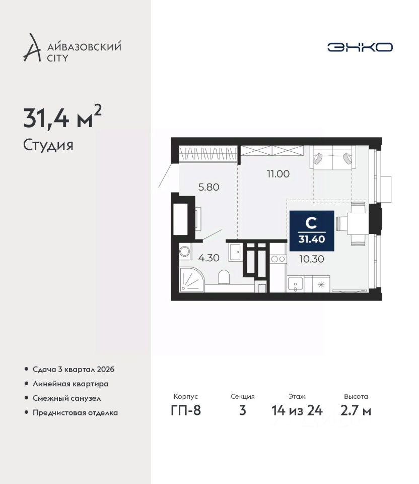 Однокомнатная квартира-студия с предчистовой отделкой в ЖК ''Айвазовский City'' на 14 этаже. Общая площадь: 31.4 кв.м., площадь гостиной 21.3 кв.м., из которых 10.3 кв.м. выделено под кухонную зону. Все окна выходят на одну сторону. В квартире один совмещенный санузел. Высота потолков 2.7 м.