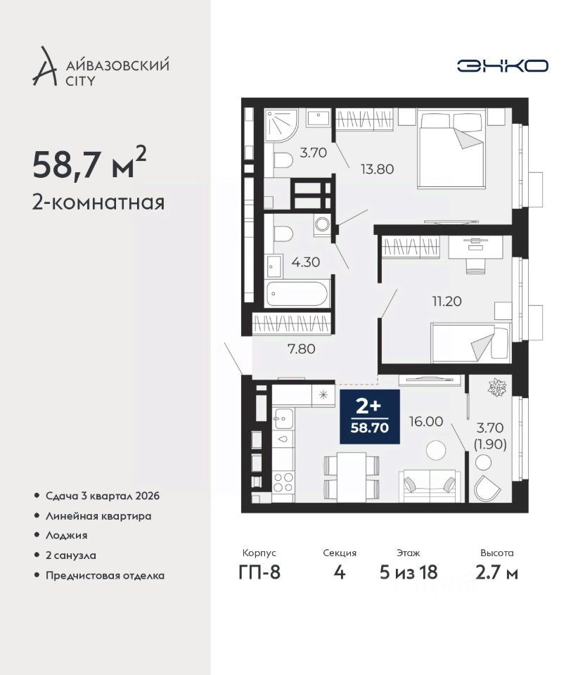 Просторная 2-комн. квартира с предчистовой отделкой в ЖК ''Айвазовский City'' на 5 этаже. Общая площадь: 58.7 кв.м., жилая: 25 кв.м., площадь просторной кухни-столовой: 16 кв.м. Комнаты изолированные, все окна выходят на одну сторону. В квартире одна лоджия, два совмещенных санузла. Высота потолков 2.7 м.