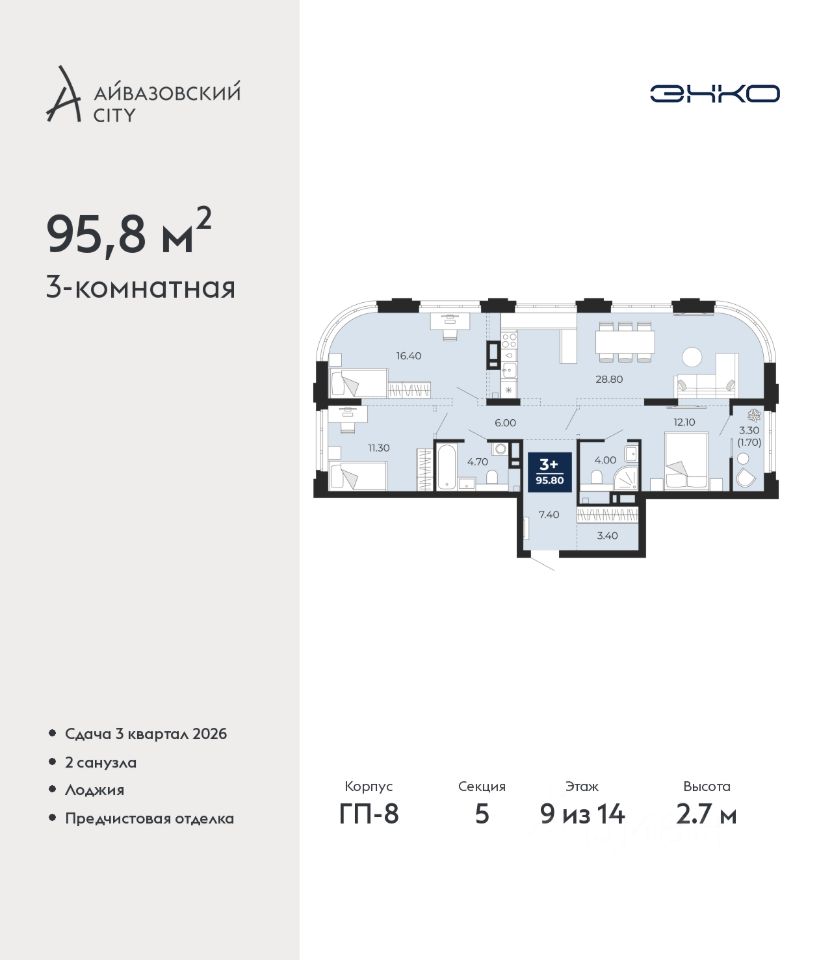 Продается трехкомнатная квартира с предчистовой отделкой в ЖК ''Айвазовский City'' на 9 этаже. Общая площадь: 95.8 кв.м., жилая: 39.8 кв.м., площадь просторной кухни-столовой: 28.8 кв.м. Квартира без проходных комнат, окна выходят нa три cтopoны дома. В квартире одна лоджия, два совмещенных санузла. Высота потолков 2.7 м.