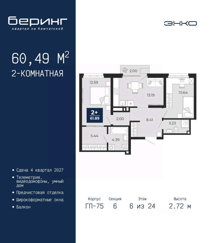 Просторная 2-комн. квартира с предчистовой отделкой в ЖК ''Беринг'' на 6 этаже. Общая площадь: 60.49 кв.м., жилая: 23.23 кв.м., площадь просторной кухни-столовой: 13.19 кв.м. Комнаты изолированные, все окна выходят на одну сторону. В квартире один балкон, два совмещенных санузла. Высота потолков 2.72 м.