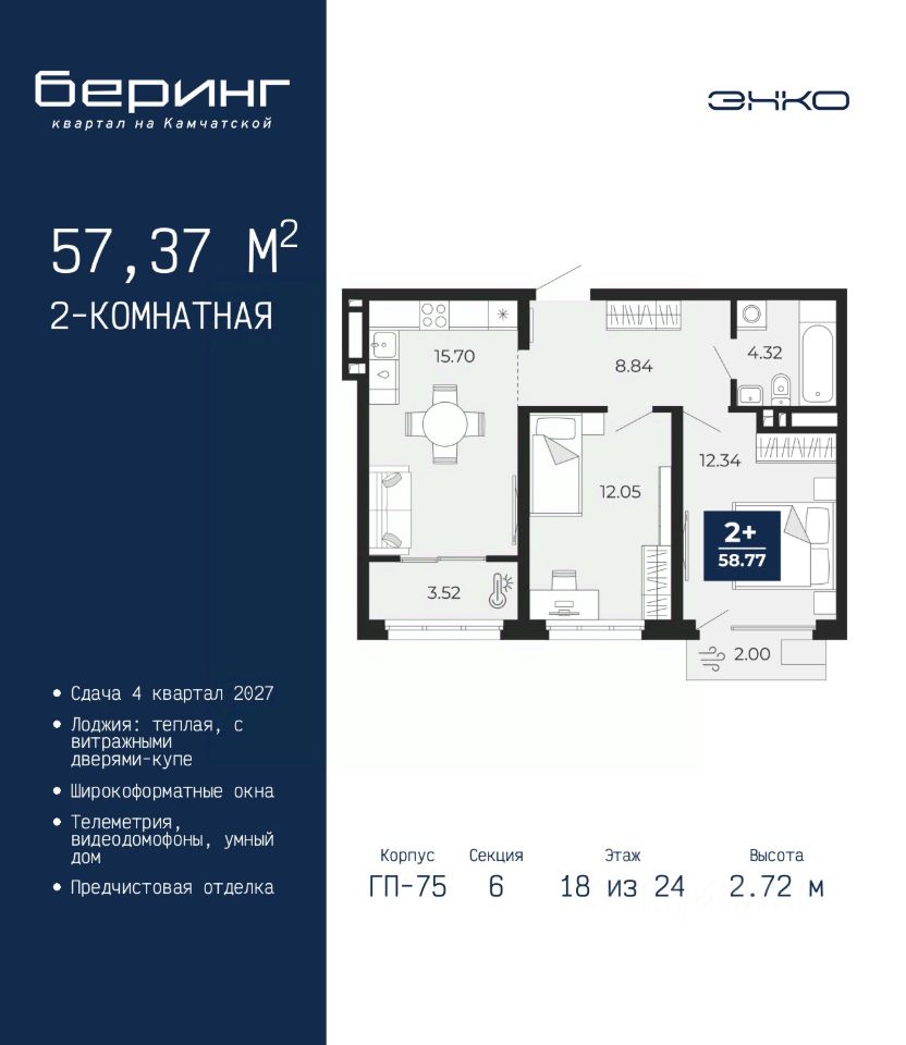 Продается 2-комн. квартира с предчистовой отделкой в ЖК ''Беринг'' на 18 этаже. Общая площадь: 57.37 кв.м., жилая: 24.39 кв.м., площадь просторной кухни-столовой: 15.7 кв.м. Комнаты изолированные, все окна выходят на одну сторону. В квартире один балкон и одна лоджия, один совмещенный санузел. Высота потолков 2.72 м.