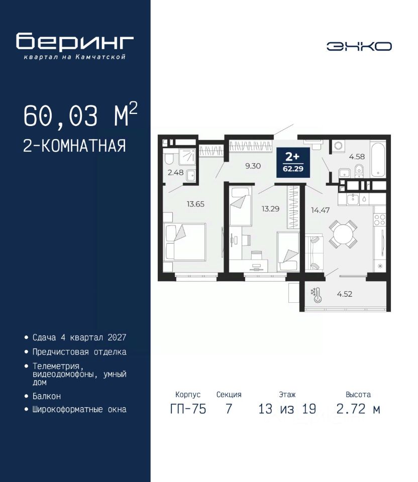 2-комн. квартира с предчистовой отделкой в ЖК ''Беринг'' на 13 этаже. Общая площадь: 60.03 кв.м., жилая: 26.94 кв.м., площадь просторной кухни-столовой: 14.47 кв.м. Комнаты изолированные, все окна выходят на одну сторону. В квартире один балкон, два совмещенных санузла. Высота потолков 2.72 м.
