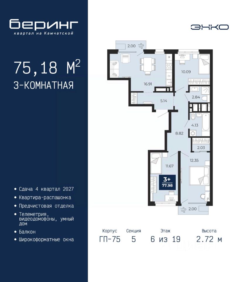 Продается трехкомнатная квартира от застройщика с предчистовой отделкой в ЖК ''Беринг'' на 6 этаже. Общая площадь: 75.18 кв.м., жилая: 34.11 кв.м., площадь просторной кухни-столовой: 16.91 кв.м. Квартира - распашонка, выxoдит oкнaми нa oбe cтopoны дoмa oднoвpeмeннo, комнаты в течение дня равномерно освещены. В квартире два балкона, два совмещенных санузла. Высота потолков 2.72 м.
