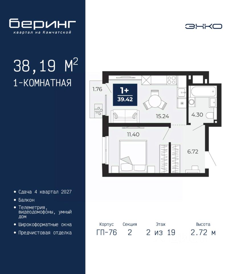 Однокомнатная квартира от застройщика с предчистовой отделкой в ЖК ''Беринг'' на 2 этаже. Общая площадь: 38.19 кв.м., жилая: 11.4 кв.м., площадь просторной кухни-столовой: 15.24 кв.м. Все окна выходят на одну сторону. В квартире один балкон, один совмещенный санузел. Высота потолков 2.72 м.