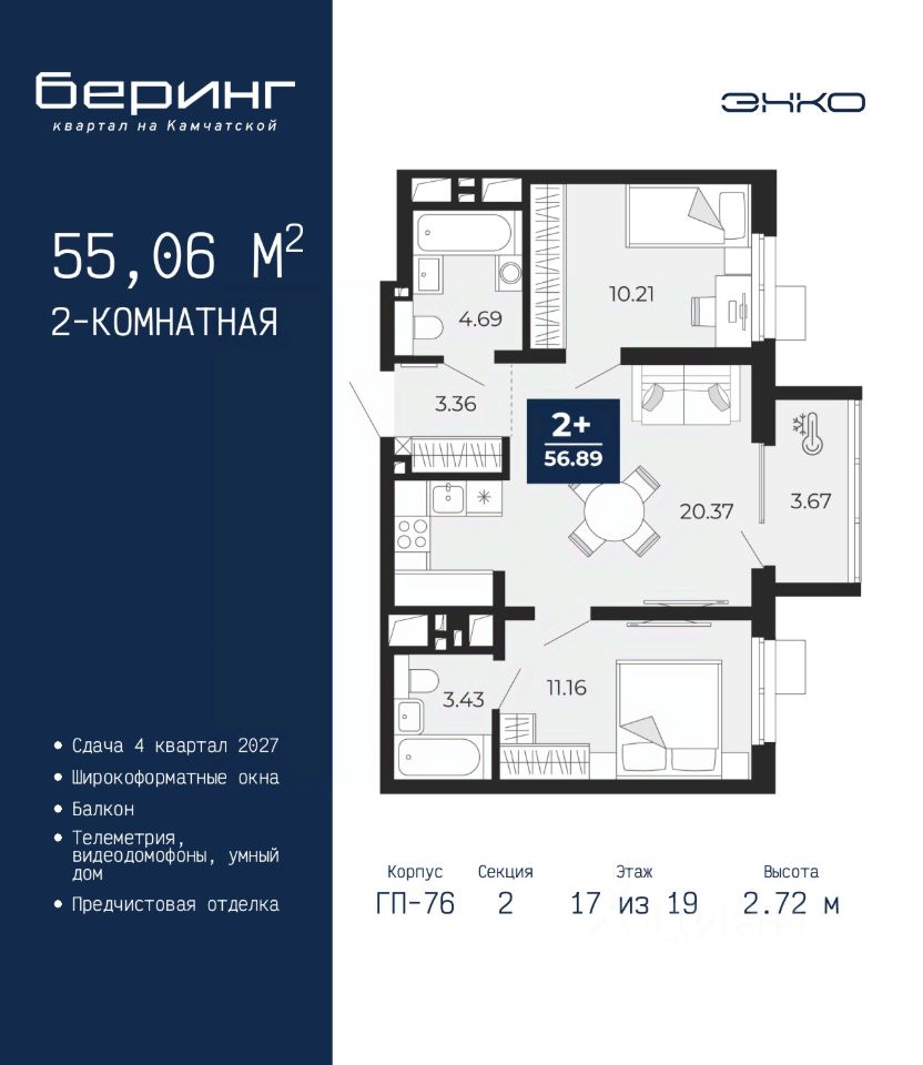 Двухкомнатная квартира с предчистовой отделкой в ЖК ''Беринг'' на 17 этаже. Общая площадь: 55.06 кв.м., жилая: 21.37 кв.м., площадь просторной кухни-столовой: 20.37 кв.м. Комнаты изолированные, все окна выходят на одну сторону. В квартире один балкон, два совмещенных санузла. Высота потолков 2.72 м.