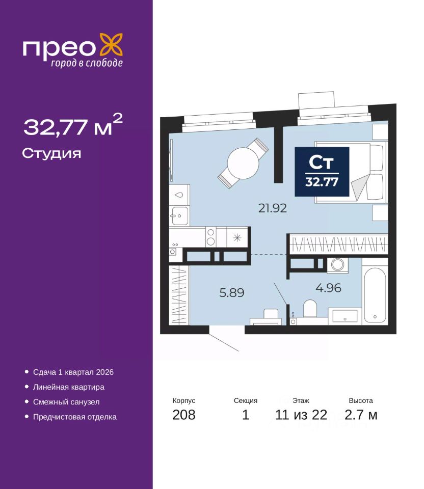 Продается однокомнатная квартира-студия с предчистовой отделкой в ЖК ''Прео'' на 11 этаже. Общая площадь: 32.77 кв.м., площадь гостиной 21.92 кв.м., из которых 5 кв.м. выделено под кухонную зону. Все окна выходят на одну сторону. В квартире один совмещенный санузел. Высота потолков 2.7 м.