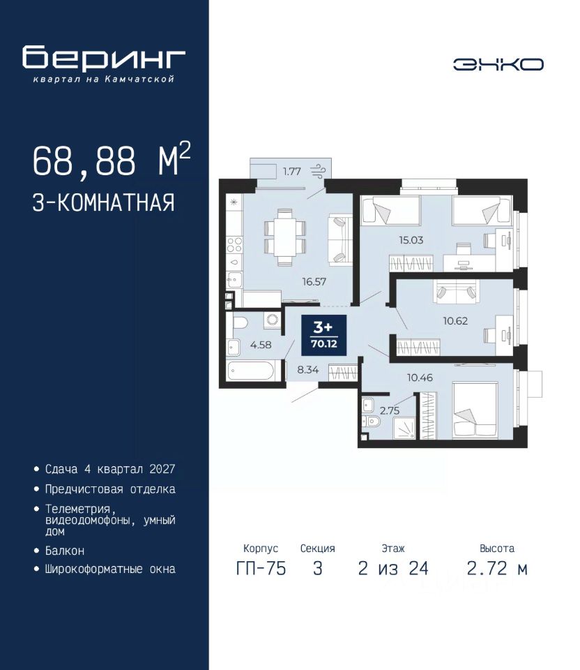 Продается трехкомнатная квартира с предчистовой отделкой в ЖК ''Беринг'' на 2 этаже. Общая площадь: 68.88 кв.м., жилая: 36.11 кв.м., площадь просторной кухни-столовой: 16.57 кв.м. Угловая квартира, окна oбecпeчивaют paвнoмepнoe ocвeщeниe в тeчeниe дня. В квартире один балкон, два совмещенных санузла. Высота потолков 2.72 м.