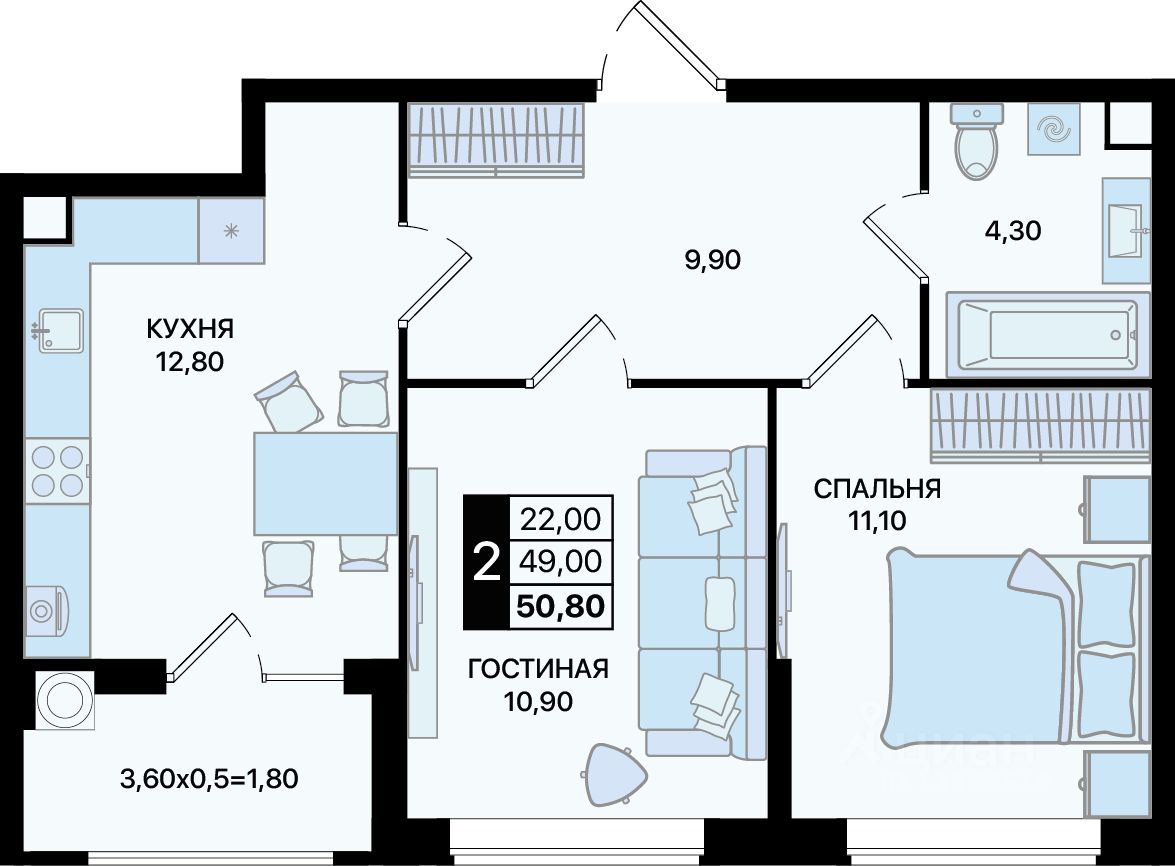 Общая площадь50,8 м2
