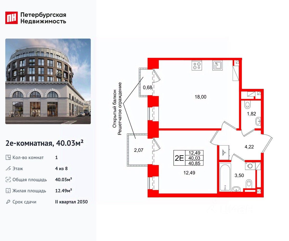 Удобная, классическая, функциональная европланировка, большая кухня-гостиная 18 м², просторная прихожая 4.22 м². Общая площадь квартиры - 40.03 м², жилая 12.49 м², высота потолка 2.7 м.