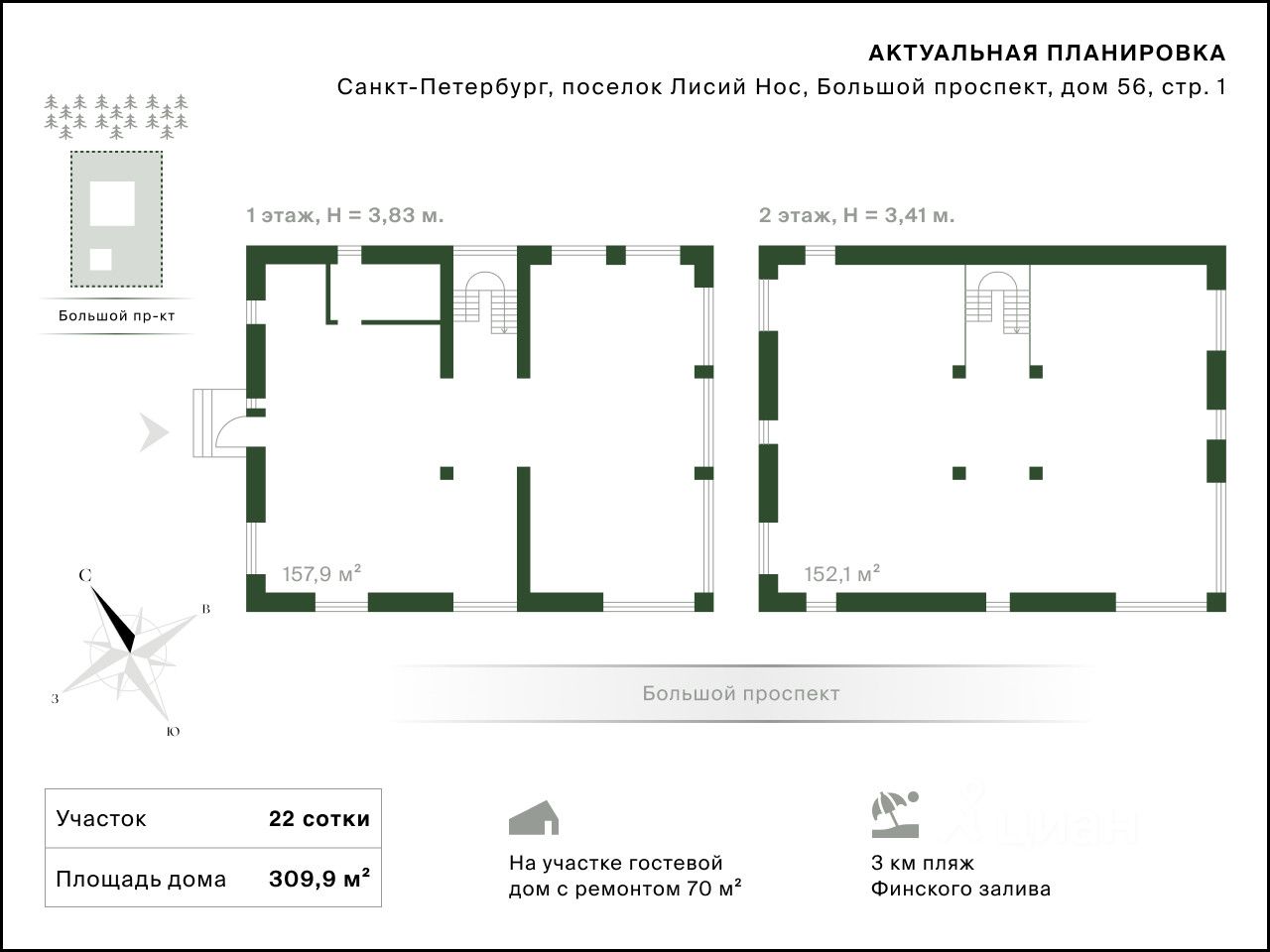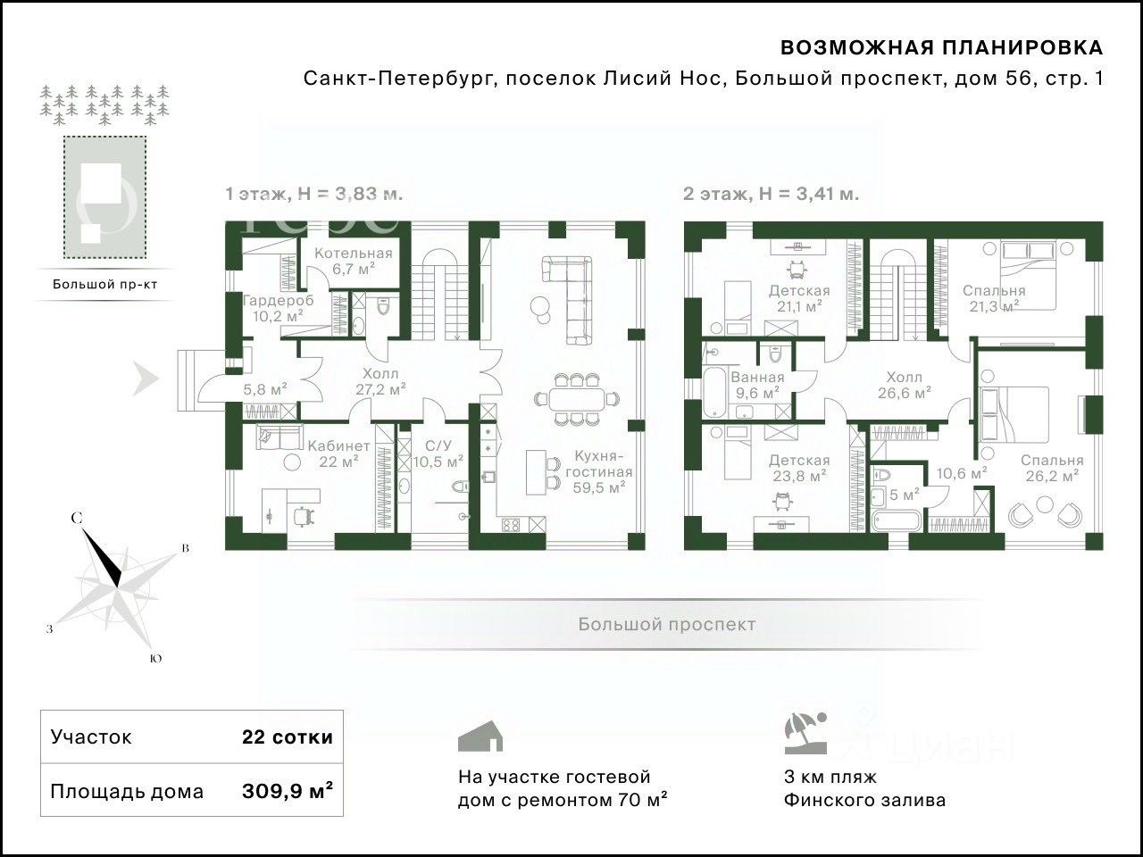 Арт. 75079767 Предлагается к продаже новый дом общей площадью 309 м2, в одной из самых престижных и удобных локаций Выборгского района - в поселке Лисий Нос. Участок размером 22 сотки имеет правильную форму и выровненную территорию. Жизнь в Лисьем носу идеально подойдет тем, кто ценит комфорт и близость к природе, для кого важен пейзаж за окном, и кто устал от жизни в мегаполисе. Объект расположен очень удачно в конце Большого проспекта, и граничит с одной стороны с лесом. На территории произрастают вековые сосны, кедры, яблони, груши, плодовые кустарники.