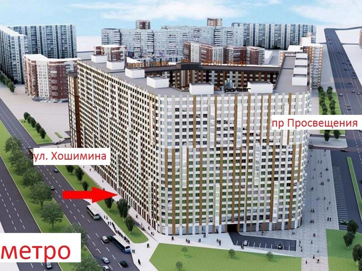 Просторное помещение свободного назначения расположено в ЖК YES, в нескольких минутах ходьбы от станции метро ''Проспект Просвещения'' (менее 500 метров). Вход и фасад выходят на улицу Хошимина.