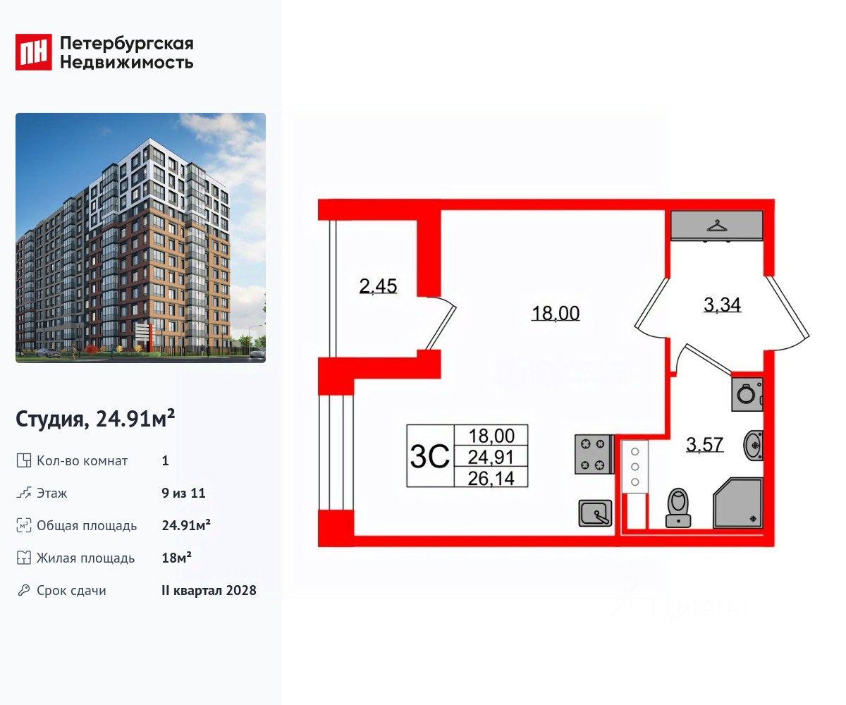 Удобная, классическая, функциональная европланировка, просторная прихожая 3.34 м². Общая площадь студии - 24.91 м², жилая 18 м², высота потолка 2.77 м.