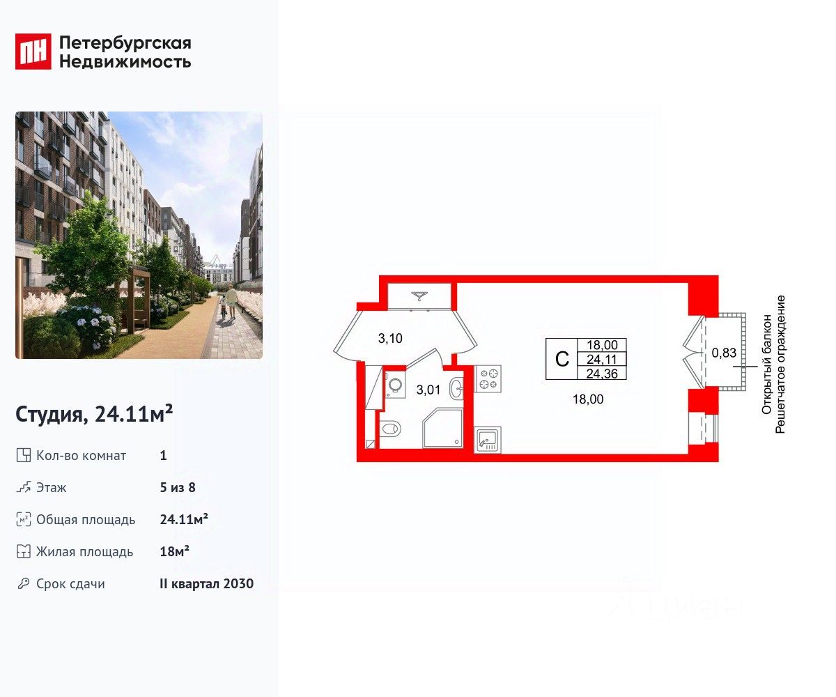 Удобная, классическая, функциональная европланировка, вместительная прихожая 3.1 м². Общая площадь студии - 24.11 м², жилая 18 м², высота потолка 2.7 м.