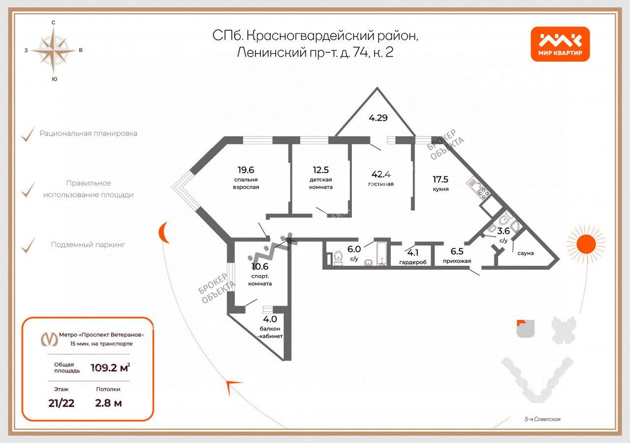 Арт. 127411147 На 21 этаже 22 этажного дома продается 4-евро квартира, общей площадью 109,2кв.м. Квартира состоит из: кухня, гостиная, детская комната, спальня, спортивная комната, 2 утепленные застекленные лоджии, в одной и которой находится кабинет, 2 СУ, в одном расположена сауна. Квартира оборудована 4 камерами видеонаблюдения: первая камера установлена перед парадной, вторая перед дверью в звонке, третья общая в лифтовом холле, четвертая в прихожей непосредственно в квартире. Управление камерами со смартфона. Установлены 2 кондиционера ( в гостиной и спальне). Выполнена шумоизоляция, теплые полы в прихожей и обоих СУ, так же теплый пол в душевом поддоне. Электричество разведено на 3 фазы, всего 50кВт, с учетом сауны. Сауна оборудована печью Harvia с парогенератором, с датчиком влажностии температуры. Управление с пульта. Установлен бойлер Ariston. Вся квартира согласно технического плана, без перепланировок. Напольные покрытия в санузлах, кухне и прихожей - керамогранит, в гостиной - паркет, в детской и спортивной комнате - ковролиновая плитка. Покрытие стен в технике венецианской штукатурки с использованием гибса. В санузлах использованы керамогранит, мраморная плитка. Вокруг дома развитая инфраструктура: школа в 20м, детский сад 500м, детская и взрослая поликлиники на другой улице (Брестский бульвар). Детские площадки, футбольное поле, баскетбольная площадка с резиновым покрытием. Готовая семейная квартира для семьи с 1-2 детьми. С готовым ремонтом, не требующим капиталовложения. Минимальная амортизация квартиры, ремонт с 2021г. Приобреталась по ДДУ. Квартира полностью готова к сделке. Прямая продажа, один собственник, подходит под ипотеку, ф-9 чистая, вся сумма в договоре. Торг. Причина продажи: расширение семьи. оперативно показываю! Есть возможность приобрести 2 машиноместа с кладовыми в паркинге 39м!