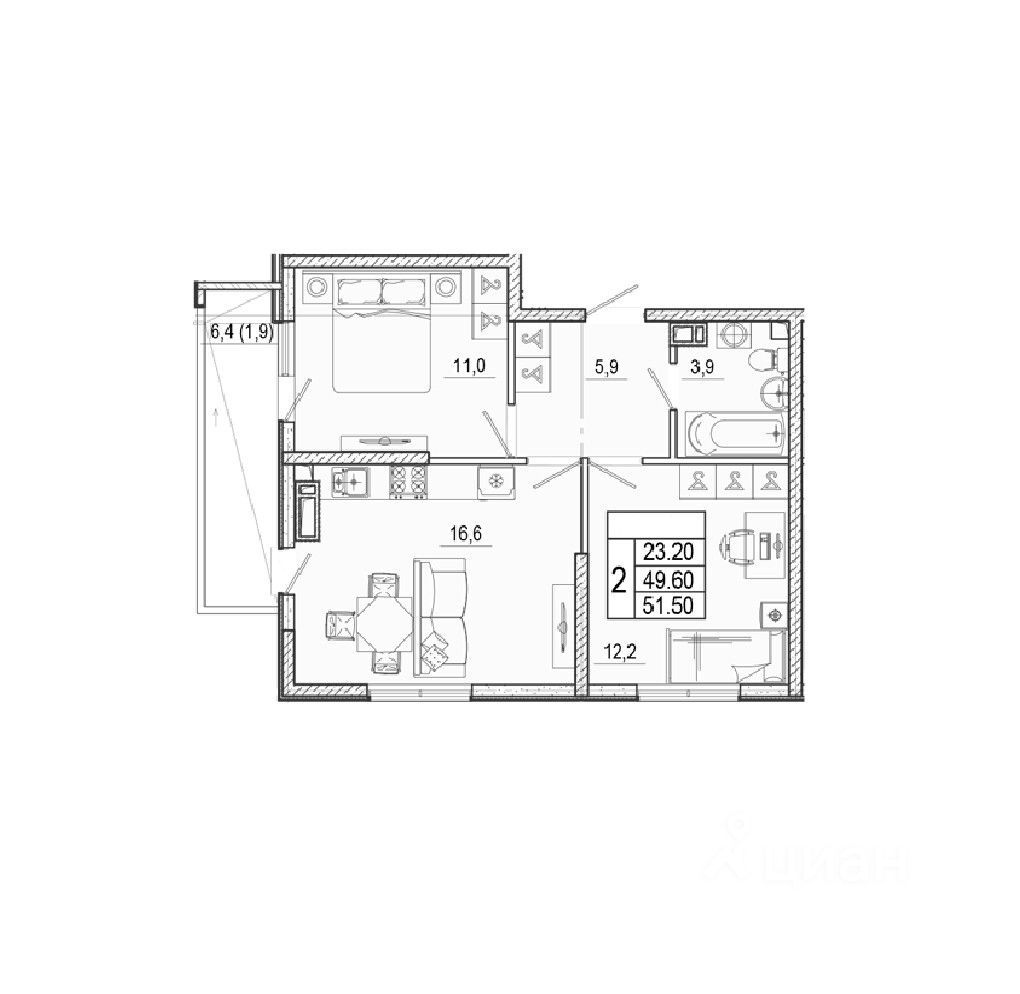 Общая площадь51,5 м2