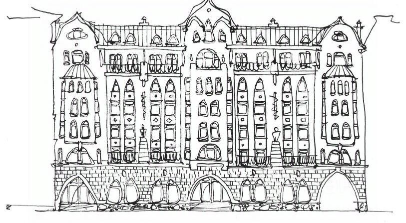 Решение фасадов построено на сочетании больших остеклённых плоскостей с глухими участками стен, облицованными натуральным камнем в контексте с исторической окружающей застройкой. Парафраз стиля модерн читается в использовании натурального камня, в скалистой рельефной текстуре стен, в трапециевидном завершении оконных проёмов.