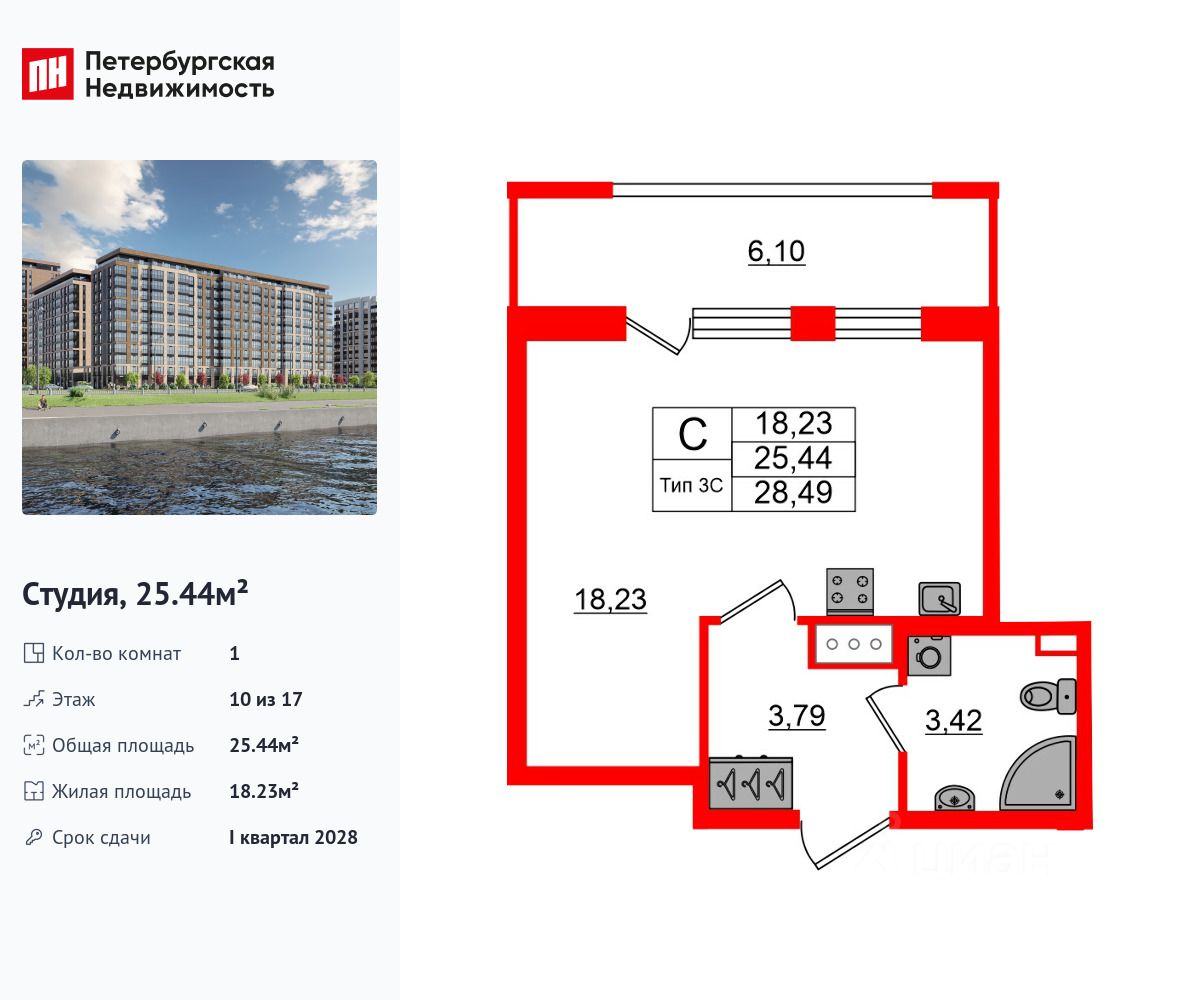 Удобная, классическая, функциональная европланировка, просторная прихожая 3.79 м². Общая площадь студии - 25.44 м², жилая 18.23 м², высота потолка 2.77 м.