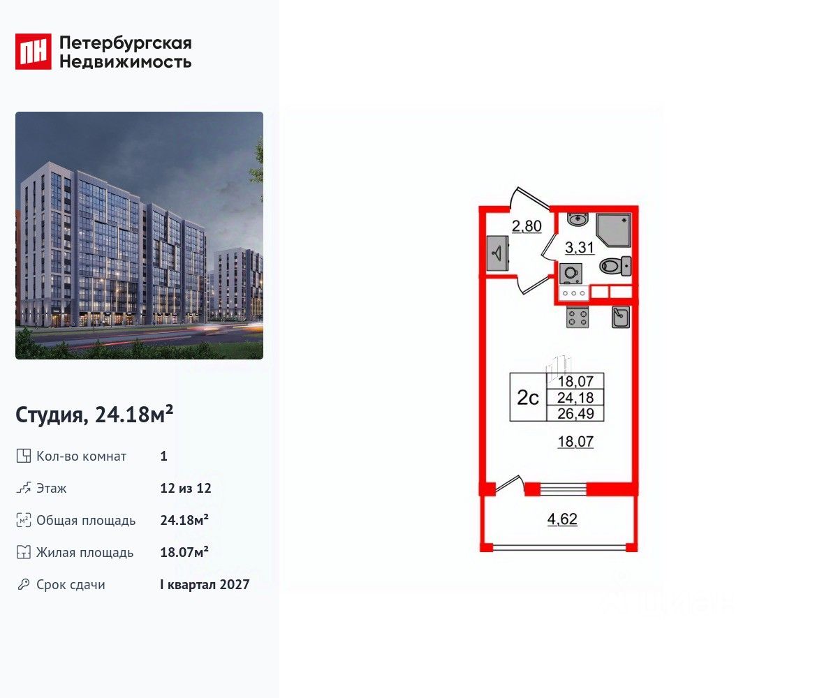Удобная, классическая, функциональная европланировка, вместительная прихожая 2.8 м². Общая площадь студии - 24.18 м², жилая 18.07 м², высота потолка 3 м.