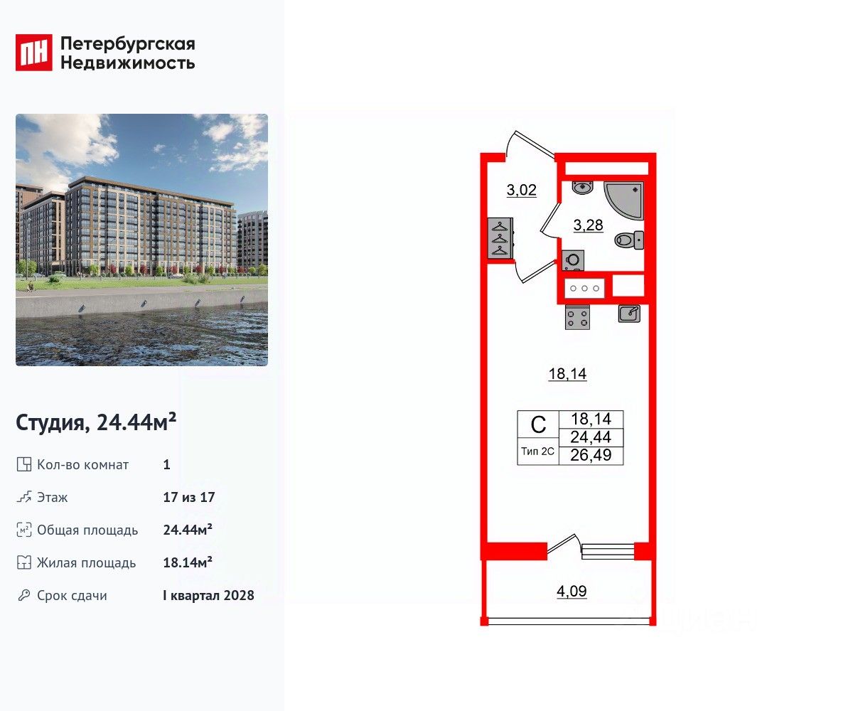 Удобная, классическая, функциональная европланировка, вместительная прихожая 3.02 м². Общая площадь студии - 24.44 м², жилая 18.14 м², высота потолка 3.04 м.