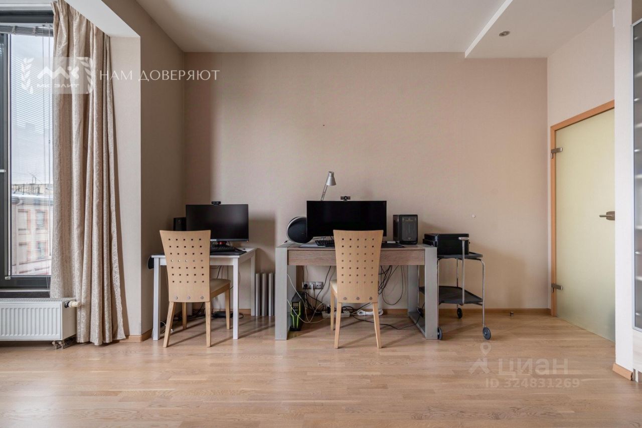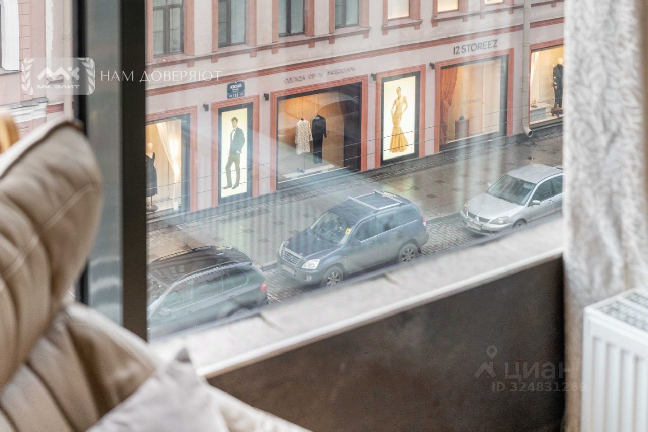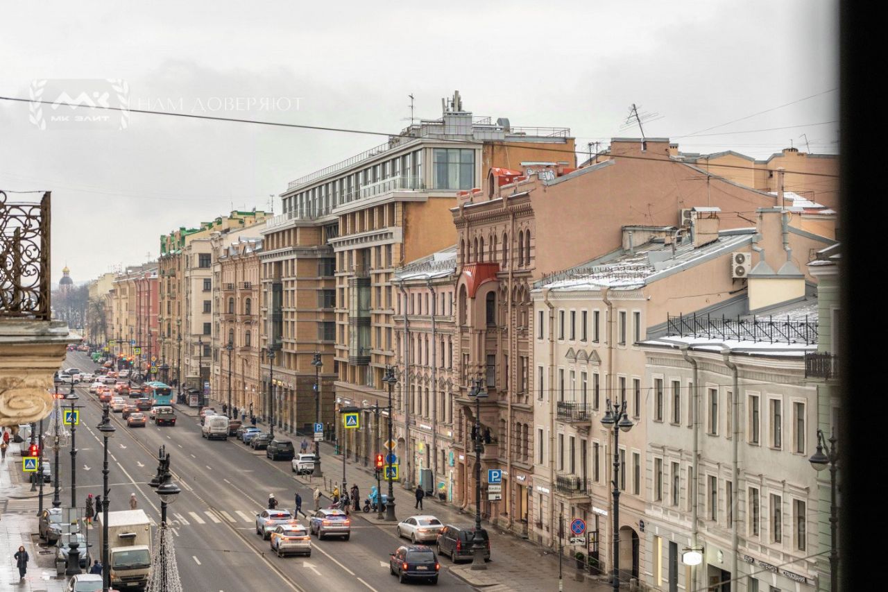 Квартира общей площадью 123 м.кв. находится на 4 этаже и предусматривает две комнаты одна из них украшена стеклянным эркером. Эркер и увеличенные окна с французскими балконами кухни-гостиной выходят на Невский проспект. Вашему взору открывается прекрасная небесная линия и панорама ажурных фасадов исторических зданий. Несмотря на оживленную локацию, в квартире тихо. Окна спальни, санузла и прихожей выходят в стильный атриум.