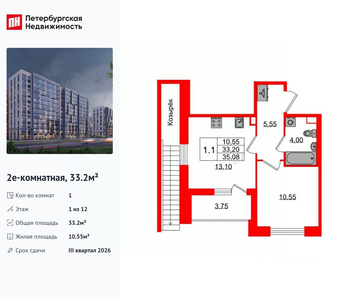 Удобная, классическая, функциональная европланировка, большая кухня-гостиная 13.1 м², просторная прихожая 5.55 м². Общая площадь квартиры - 33.2 м², жилая 10.55 м², высота потолка 2.77 м.