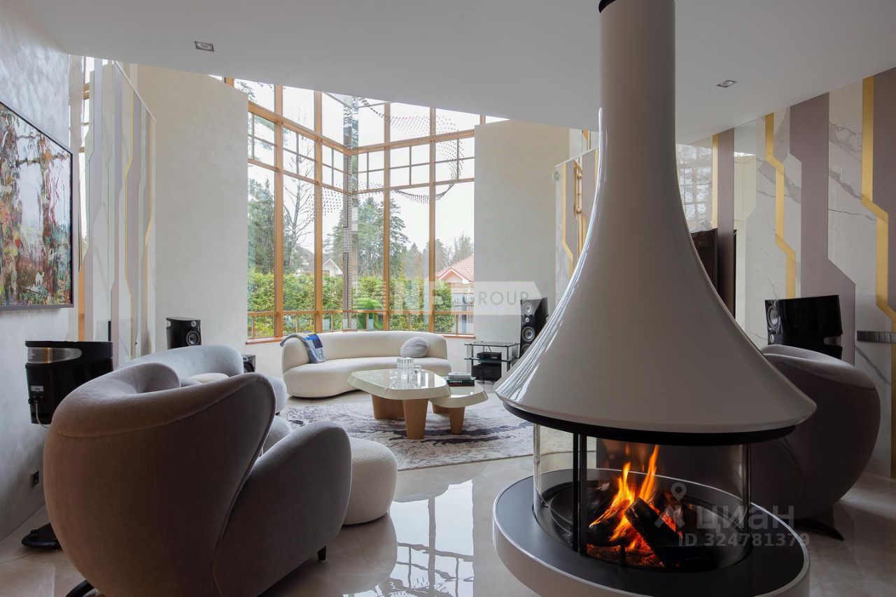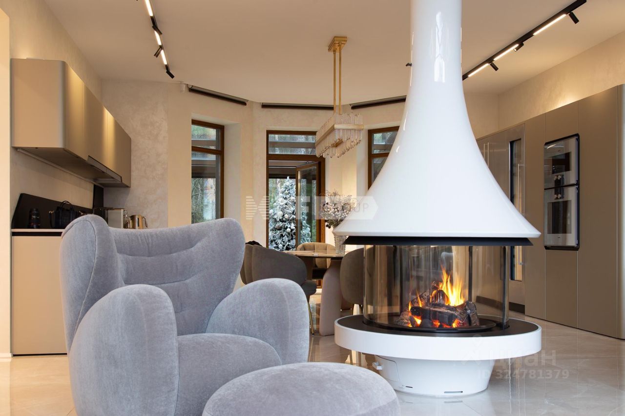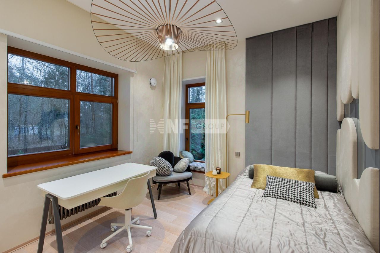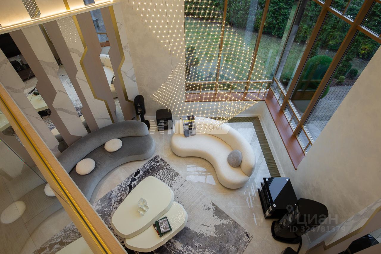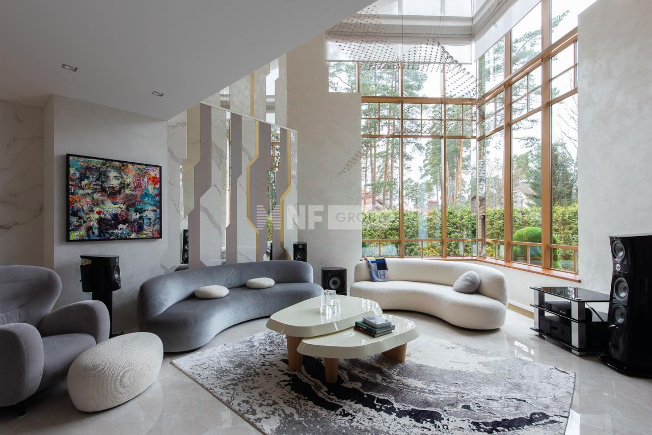 Центром дома является впечатляющая гостиная со вторым светом и эксклюзивным наполнением от Pierre Augustine Rose, а также камином Bordelet. Рядом располагается столовая с отдельной зоной кухни от премиального итальянского бренда Snaidero, оснащенной бытовой техникой Gaggenau. Продуманная планировка включает мастер-спальню с мебелью Minotti, две детских и одну гостевую спальни, кабинет, три ванных комнаты (AXOR, Porcelanosa, Cielo), санузел на первом этаже, гардеробные и просторную утепленную террасу — всё для ощущения максимального комфорта и уюта.