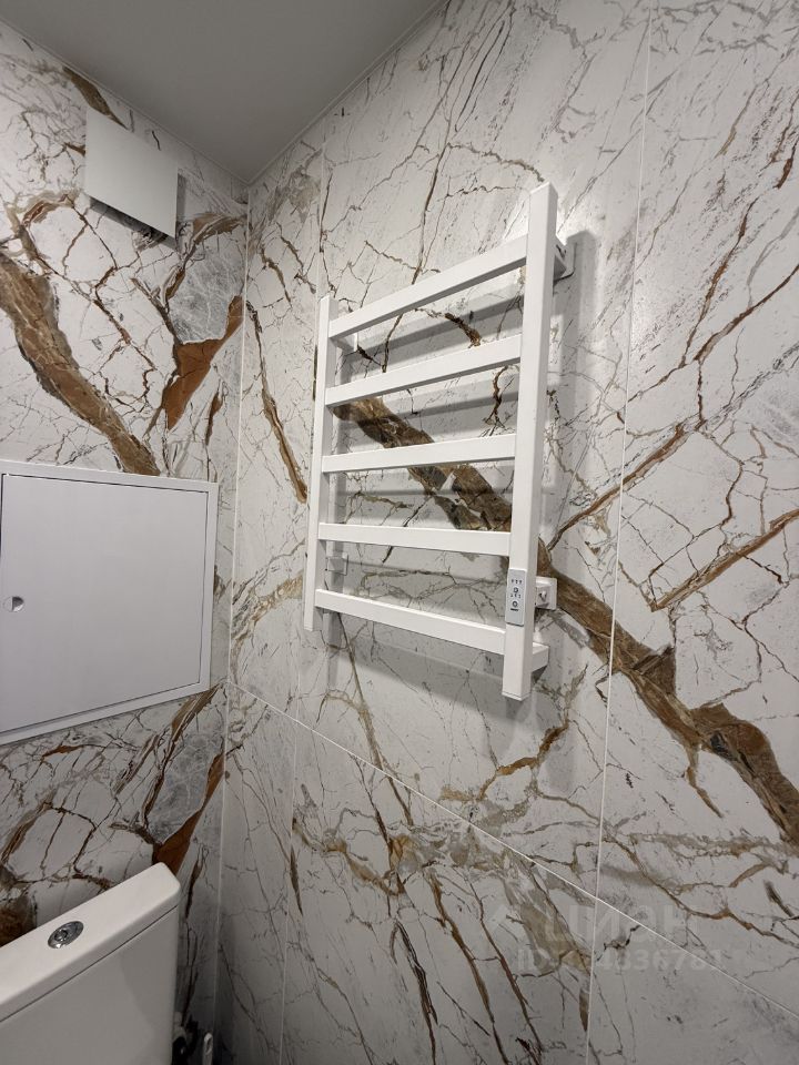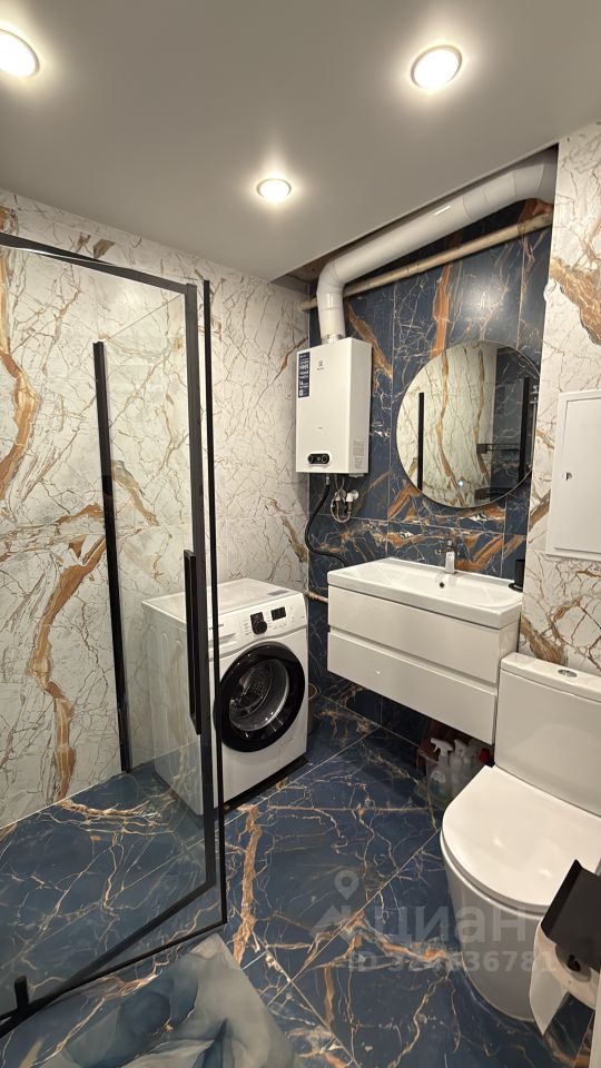 Санузел совмещённый, оформлен в современном стиле с использованием мраморных плит. В прихожей предусмотрены удобные шкафы для одежды.