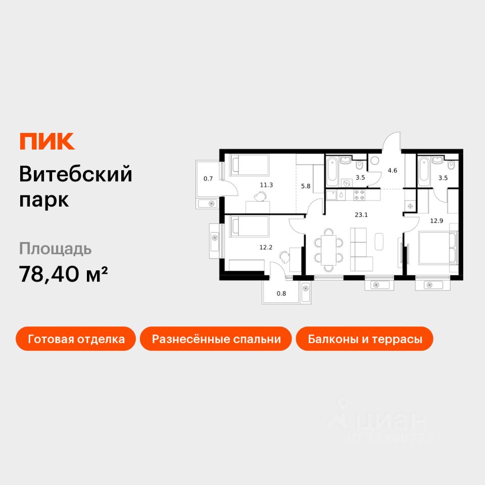 Продаётся 3-комн. квартира площадью 78,4 кв.м на 4 этаже 12 этажного дома (Корпус 7, Секция 4) проекта ПИК Витебский парк. Светлый просторный подъезд на уровне земли, функциональная планировка, большие окна, c отделкой.
