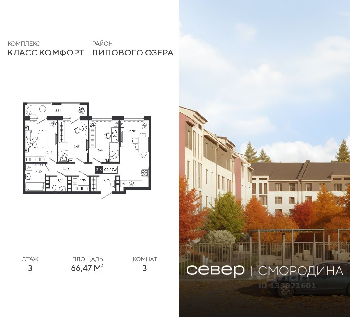 Продаётся квартира площадью 66.47 м2 в жилом комплексе ''Смородина''. Квартира находится на 3 этаже, жилая площадь квартиры 29.04 м2, площадь просторной кухни — 14.6 м2. Среди особенностей планировки — изолированные комнаты с окнами на одну сторону, 1 совмещённый санузел.