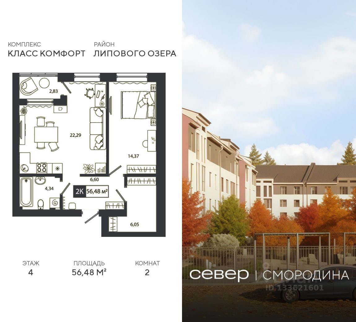 Продаётся квартира площадью 56.48 м2 в жилом комплексе ''Смородина''. Квартира находится на 4 этаже, жилая площадь квартиры 14.37 м2, площадь просторной кухни — 22.29 м2. Среди особенностей планировки — изолированные комнаты с окнами на одну сторону, 1 совмещённый санузел.