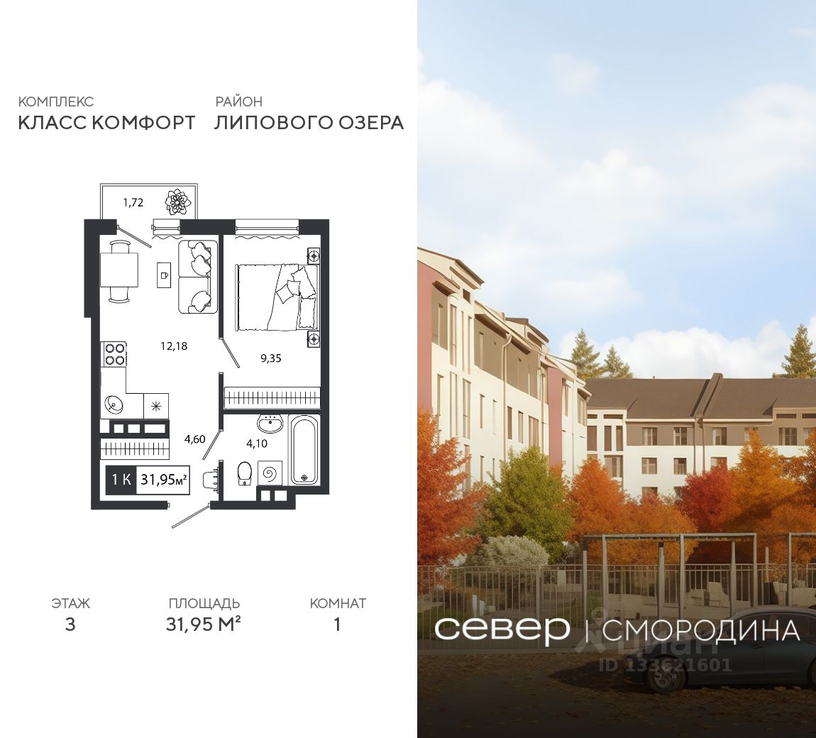 Продаётся квартира площадью 31.95 м2 в жилом комплексе ''Смородина''. Квартира находится на 3 этаже, жилая площадь квартиры 9.35 м2, площадь просторной кухни — 12.18 м2. Среди особенностей планировки — изолированные комнаты с окнами на одну сторону, 1 совмещённый санузел.