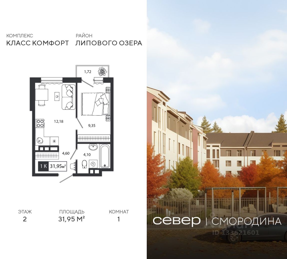 Продаётся квартира площадью 31.95 м2 в жилом комплексе ''Смородина''. Квартира находится на 2 этаже, жилая площадь квартиры 9.35 м2, площадь просторной кухни — 12.18 м2. Среди особенностей планировки — изолированные комнаты с окнами на одну сторону, 1 совмещённый санузел.