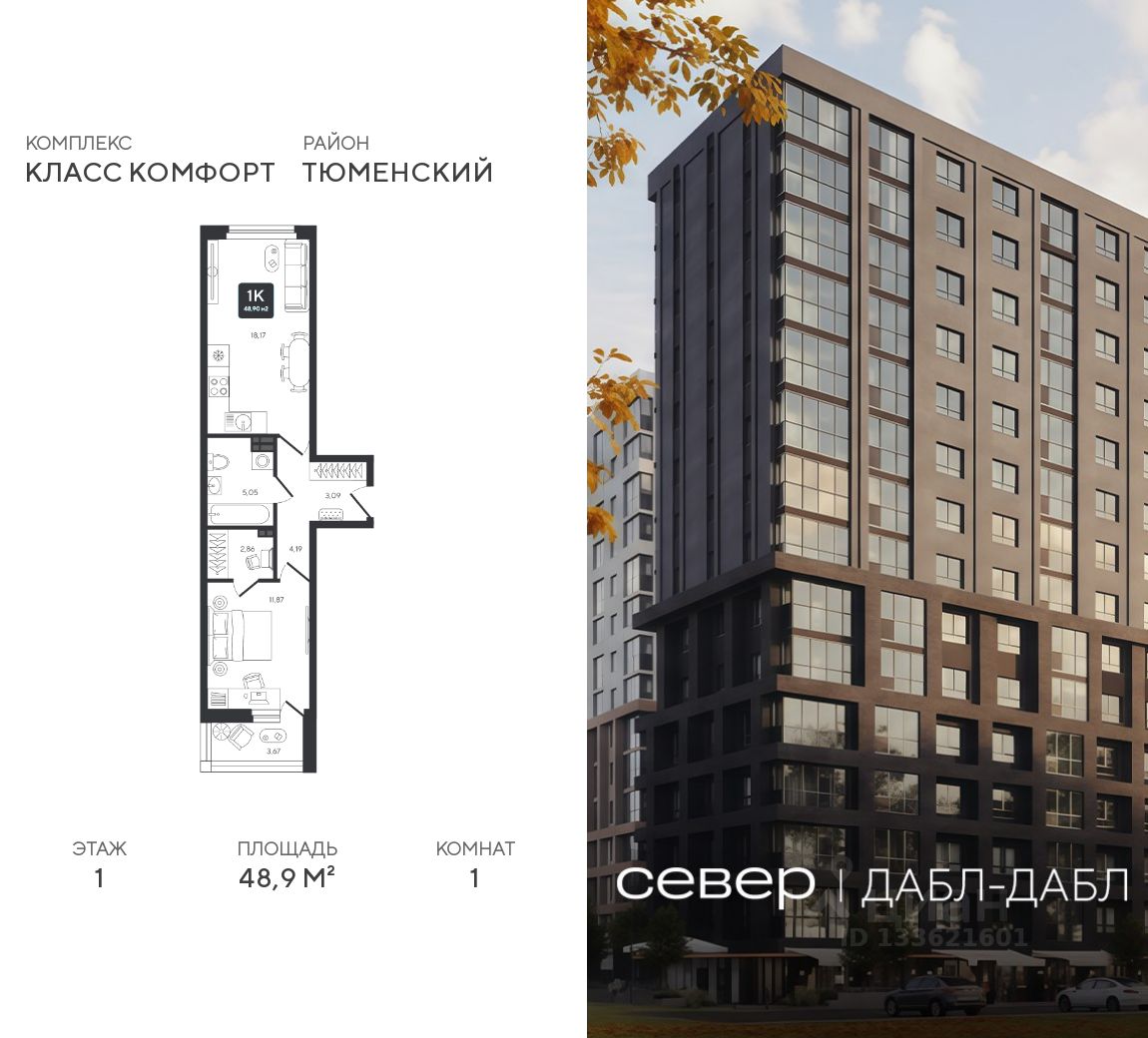 Продаётся квартира площадью 48.9 м2 в жилом комплексе ''Дабл-Дабл''. Квартира находится на 1 этаже, жилая площадь квартиры 11.87 м2, площадь просторной кухни — 18.17 м2. Среди особенностей планировки — изолированные комнаты с окнами на одну сторону, 1 совмещённый санузел.