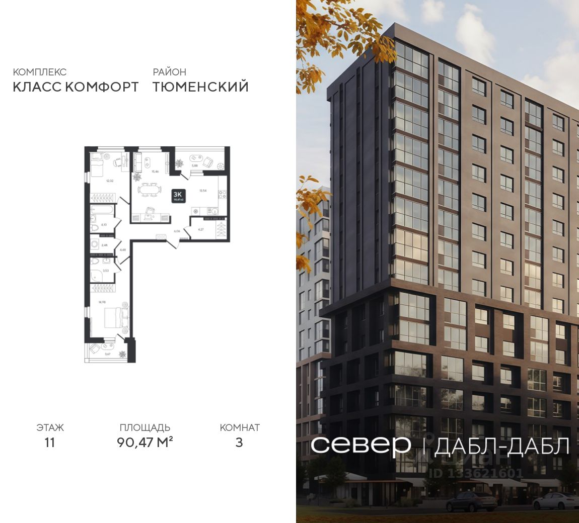Продаётся квартира площадью 90.47 м2 в жилом комплексе ''Дабл-Дабл''. Квартира находится на 11 этаже, жилая площадь квартиры 42.46 м2, площадь просторной кухни — 13.54 м2. Среди особенностей планировки — изолированные комнаты с окнами на одну сторону, 1 совмещённый санузел.