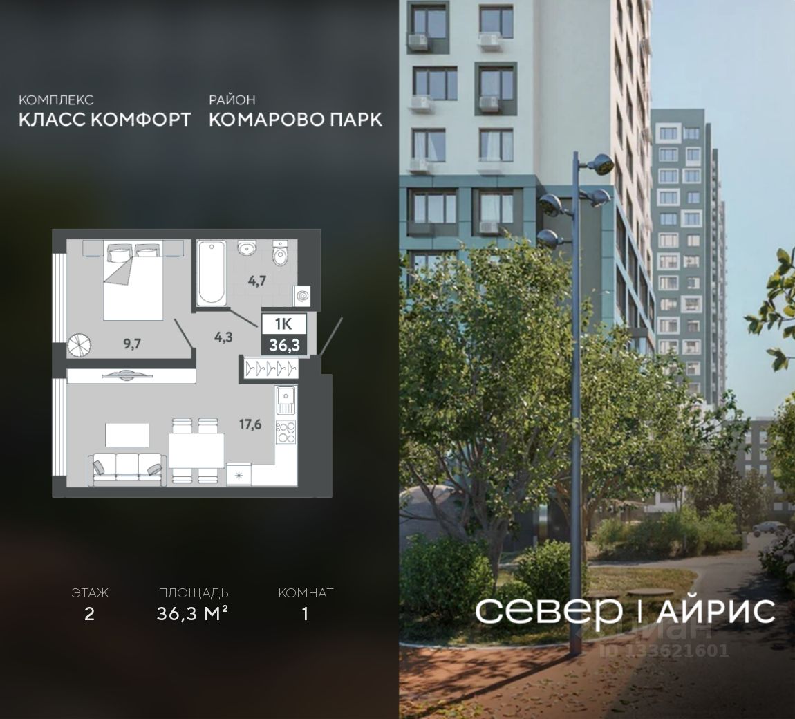 Продаётся квартира площадью 36.3 м2 в жилом комплексе ''Айрис''. Квартира находится на 2 этаже, жилая площадь квартиры 9.7 м2, площадь просторной кухни — 17.6 м2. Среди особенностей планировки — изолированные комнаты с окнами на одну сторону, 1 совмещённый санузел.
