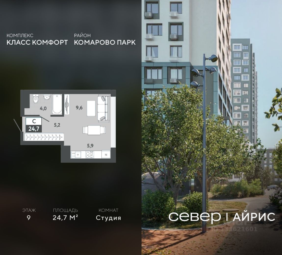 Продаётся квартира площадью 24.7 м2 в жилом комплексе ''Айрис''. Квартира находится на 9 этаже, жилая площадь квартиры 9.6 м2, площадь кухни-ниши — 5.9 м2