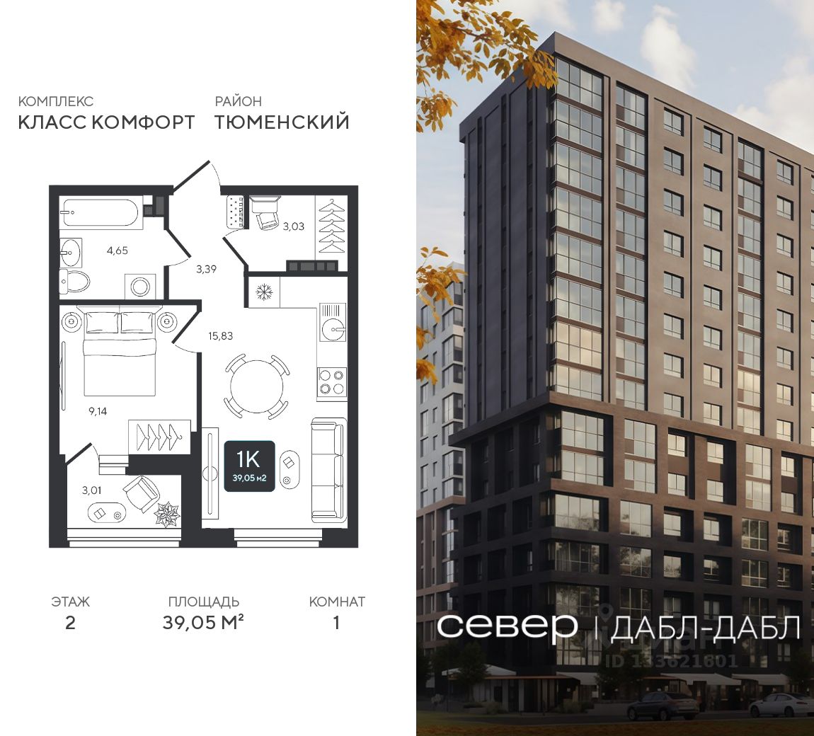 Продаётся квартира площадью 39.05 м2 в жилом комплексе ''Дабл-Дабл''. Квартира находится на 2 этаже, жилая площадь квартиры 9.14 м2, площадь просторной кухни — 15.83 м2. Среди особенностей планировки — изолированные комнаты с окнами на одну сторону, 1 совмещённый санузел.