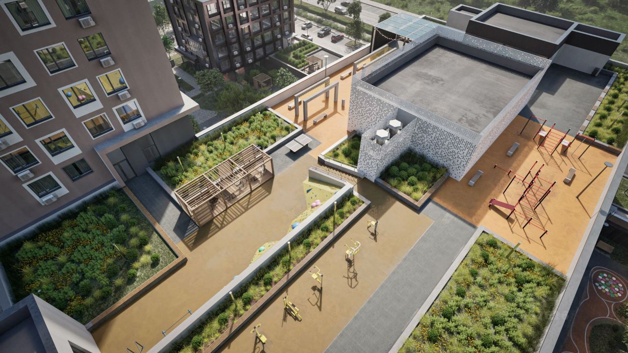Благоустройство Уютный двор — приватное пространство для жителей. В беседках можно будет почитать книгу в тишине, а в тени деревьев устроиться на пикник. На крыше многоуровневого паркинга будет лаунж-зона с кинотеатром, баскетбольная площадка и воркаут-пространство, где можно позаниматься с виртуальным тренером — достаточно отсканировать код.