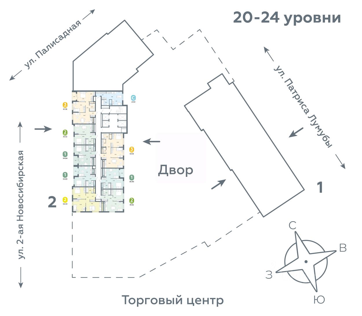 Квартал состоит из двух секций переменной этажности (от 14 до 24 этажей) и подземного паркинга с кладовыми, к которым можно будет спуститься на лифте.