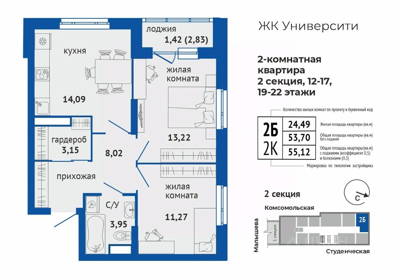 продам 2-к, Малышева, 137а11 054 316 ₽