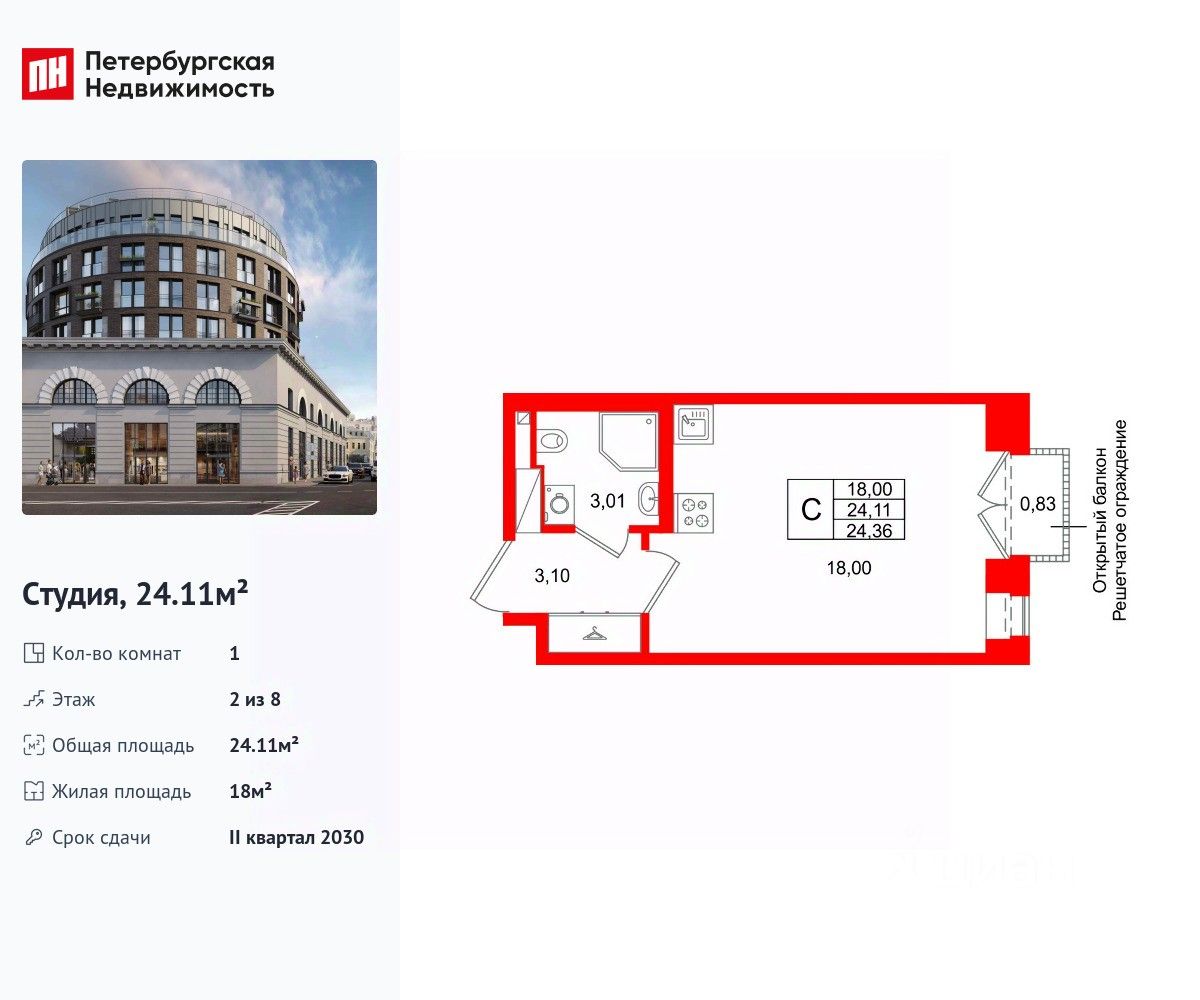 Удобная, классическая, функциональная европланировка, вместительная прихожая 3.1 м². Общая площадь студии - 24.11 м², жилая 18 м², высота потолка 2.72 м.