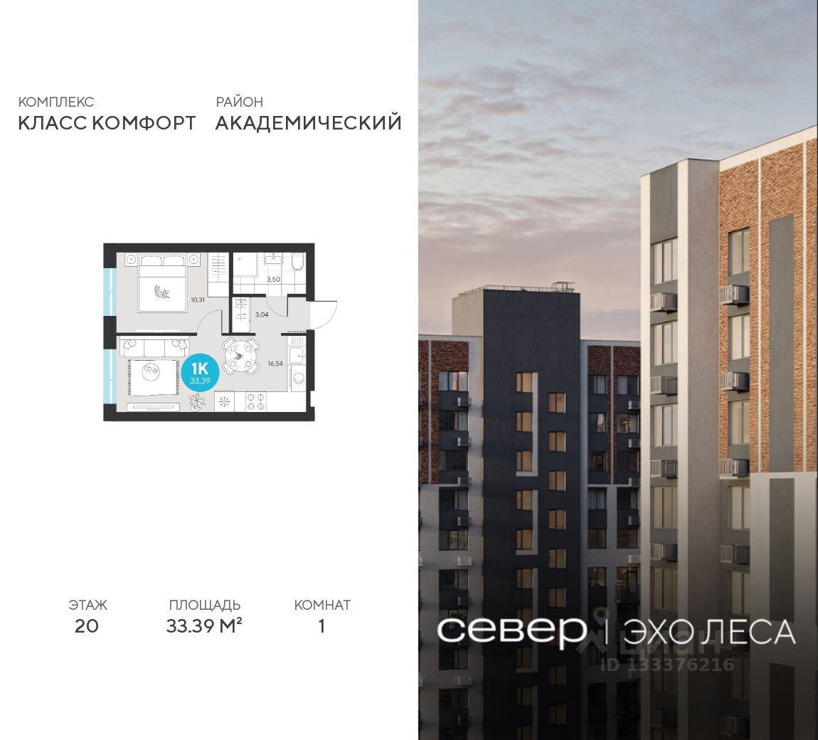 Продаётся квартира площадью 33.39 м2 в жилом комплексе ''Эхо леса''. Квартира находится на 20 этаже, жилая площадь квартиры 10.31 м2, площадь просторной кухни — 16.54 м2. Среди особенностей планировки — изолированные комнаты с окнами на одну сторону, 1 совмещённый санузел.