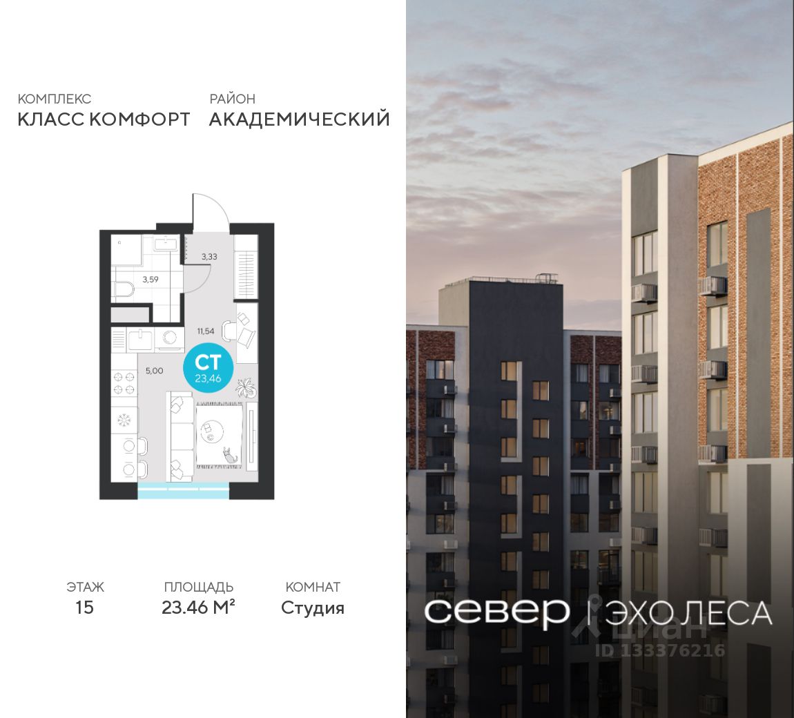 Продаётся квартира площадью 23.46 м2 в жилом комплексе ''Эхо леса''. Квартира находится на 15 этаже, жилая площадь квартиры 11.54 м2, площадь кухни-ниши — 5 м2.