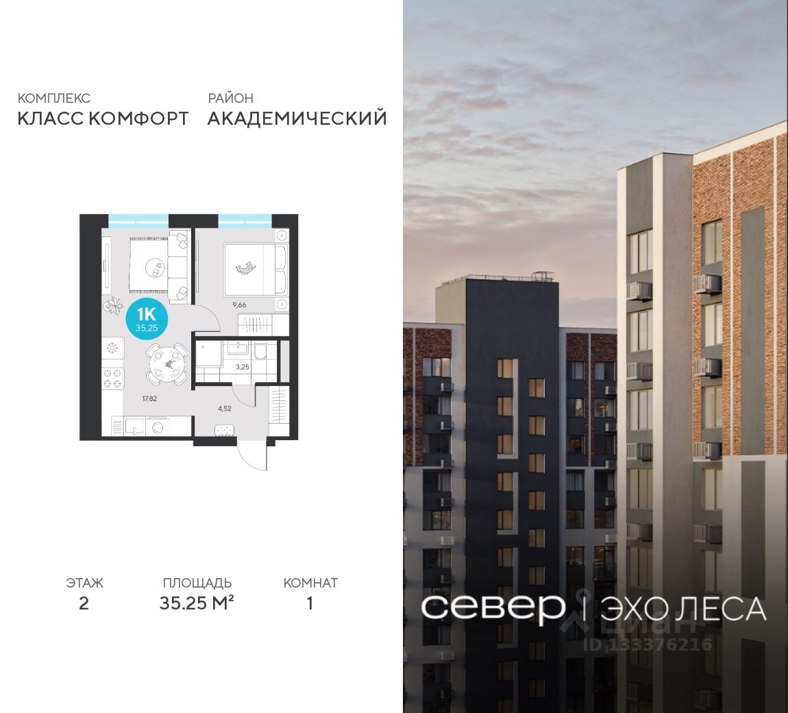Продаётся квартира площадью 35.25 м2 в жилом комплексе ''Эхо леса''. Квартира находится на 2 этаже, жилая площадь квартиры 9.66 м2, площадь просторной кухни — 17.82 м2. Среди особенностей планировки — изолированные комнаты с окнами на одну сторону, 1 совмещённый санузел.