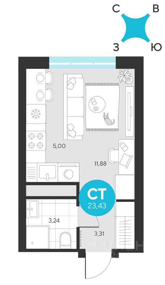 Продаётся квартира площадью 23.43 м2 в жилом комплексе ''Эхо леса''. Квартира находится на 8 этаже, жилая площадь квартиры 11.88 м2, площадь кухни-ниши — 5 м2.