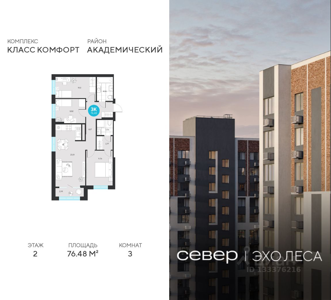 Продаётся квартира площадью 76.48 м2 в жилом комплексе ''Эхо леса''. Квартира находится на 2 этаже, жилая площадь квартиры 31.5 м2, площадь просторной кухни — 23.13 м2. Среди особенностей планировки — изолированные комнаты с окнами на одну сторону, 1 совмещённый санузел.