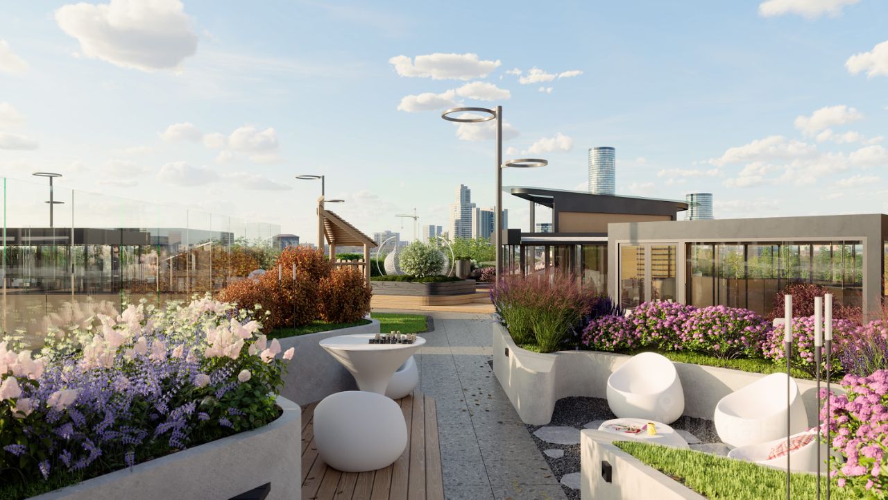 Благоустройство Двор жилого квартала расположен на крыше здания. Местом притяжения станет лаунж-зона с ландшафтным садом и шахматными столиками. Для отдыха в прохладное время года предусмотрены тёплые обогреваемые беседки. Детская зона — это горки, качели, игровые площадки и песочница.